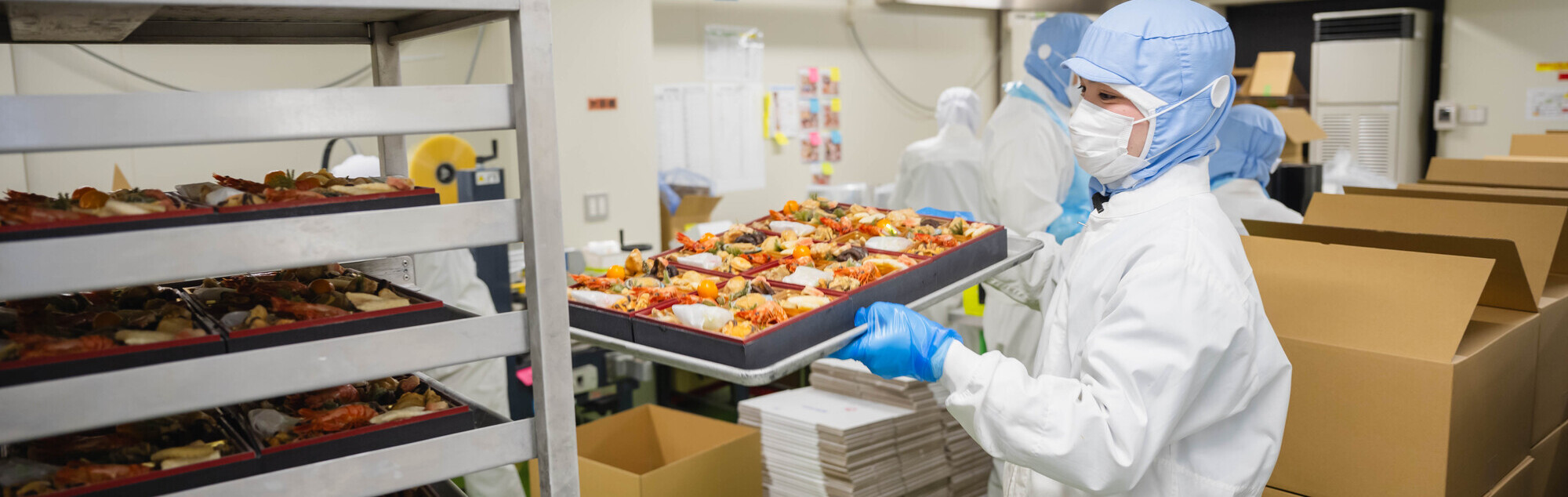 味付けエビやアワビ、焼き魚など、おせち料理に使われる食材パーツを製造しています。国内の主要工場では、現在約100種類の商材を製造。少量多品種を強みとして、あらゆる食材や調味料を使いオリジナルの商品を生み出しています。冷凍・解凍後も、作りたてと変わらない食感や風味を保つ技術の高さが強みです。