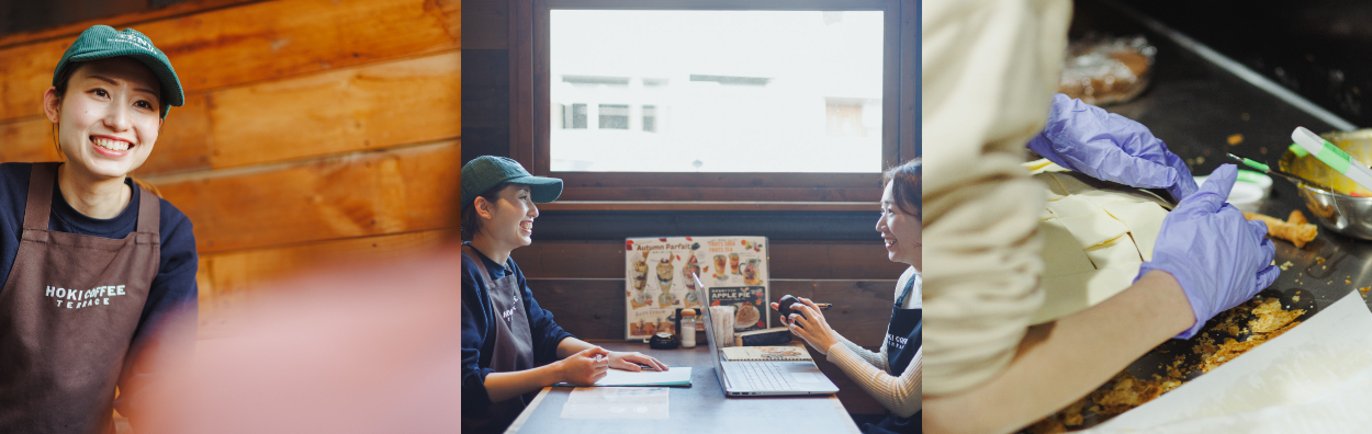 ◎会社はもともとデザイン会社なので、店内のディスプレイや装飾づくり、毎月のメニュー表作成など、デザインにも携わることができます。珈琲の焙煎を本格的に学びたい人も大歓迎です。