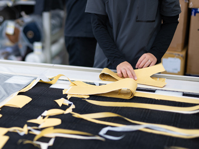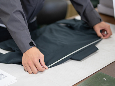 本縫い・特殊ミシン操作: 複雑なパターンや高機能素材に対し、ミリ単位の精度で縫製を行います。